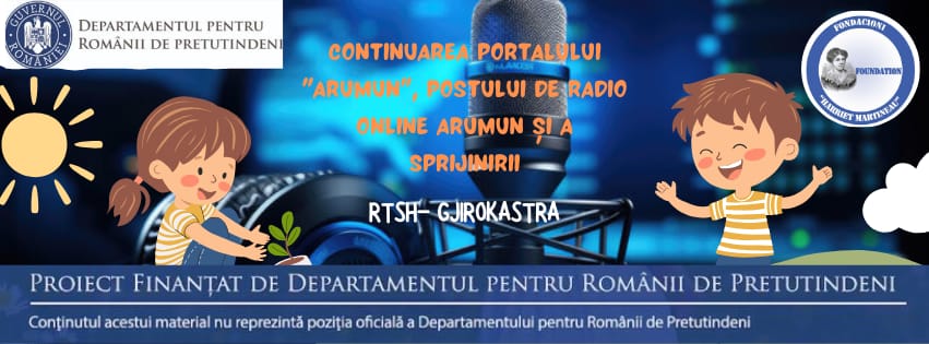 Pi radio ARUMUN ḑuǎ di ḑuǎ se dau puezii rămăneşti, teatru, interviu, legi, folclor, hãbãri rămăneşti! Intră pi www.arumun.com și avḑăţi radio Arumun, un radio ti rămănii dit Arbiniși. Proiectu “Continuarea portalului “arumun”, postului de radio online si continuarea sprijinirii postului RTSH-Gjirokastra” easti realizat cu susţănerea Departamentului ti Românii dit Iuțido. Conținutul aştilui material nu reprezintă poziția oficială a Departamentului ti Românii dit Iuțido.
