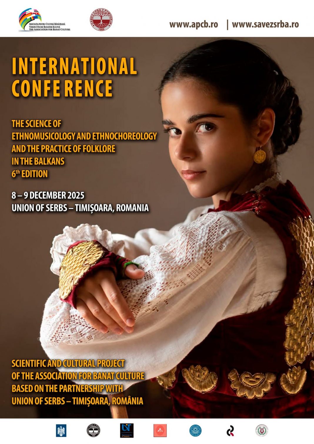 Asociația pentru Cultură Bănățeană, prin parteneriatul de înalță ținută culturală și științifică cu Uniunea Sârbilor din România, organizează în zilele de 8 și 9 decembrie 2025 cea de-a VI-a ediție a Conferinței Internaționale „The Science of Ethnomusicology and Ethnochoreology and the Practice of Folklore in the Balkans”. Participanții vor avea parte de două zile consistente, cu prezentări, dezbateri și schimburi academice vor crea noi punți culturale și științifice în regiunea balcanică. Evenimentul reunește specialiști de prestigiu din domeniile etnomuzicologiei, etnocoreologiei, bizantinologiei, etnologiei și antropologiei. Evenimentul beneficiază și de parteneri importanți: Consulatul General al Serbiei la Timișoara, Centru de Cercetare a Culturii Sârbe – Uniunea Sârbilor din România, Universitatea de Vest din Timișoara și Facultatea de Muzică și Teatru,  Akademsko Društvo za Negovanje Muzike „Gusle” Kikinda, Serbia Musicological Society of The Republic of Srpska, Bosnia and Herzegovina și Centrul de Cercetare Etno-Muzicologică „Nicolae Ursu”.
