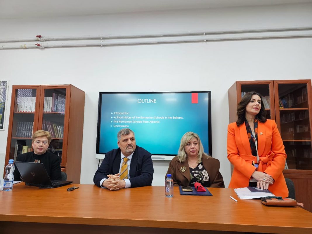 Ambasadorul României în Republica Albania dl. Octavian Șerban a efectuat joi 5 decembrie 2025, o vizita la Universiteti “Fan S.Noli”- UNIKO din Corcea. Domnul Ambasador a participat la evenimentul organizat de Departamentul de Limbi Străine, mini-conferința: „Predarea limbii române ca limbă minoritară în trecut și prezent: provocări și oportunități”, o inițiativă a lectorului, prof. a.s. dr. Daniela Stoica, în cadrul activităților culturale și de cercetare pentru anul universitar 2025–2026. În deschiderea conferinței a luat cuvântul prof. dr. Jonela Spaho, decanul Facultății de Educație și Filologie, care, printre altele, a subliniat că Universitatea joacă un rol important în predarea aromânei. De asemenea UNIKO poate oferi cursuri și programe de studiu pentru limba, literatura și cultura aromână, poate desfășura cercetări științifice și documenta dialecte și tradiții. Între timp, Universitatea „Fan S. Noli” oferă programul de studii de licență în „Limba albaneză – Literatură și limbi minoritare”. Prof. dr. Eriola Qafzezi, șefa Departamentului de Limbi Străine, a salutat întâlnirea. Conferința a avut loc în incinta Bibliotecii FEF, cu participarea personalului și studenților acestei facultăți, precum și ai Facultății de Științele Naturii și Umaniste. De asemenea, a fost prezent Ambasadorul României în Republica Albania, Excelența Sa, domnul Octavian Șerban, care a vorbit în calitate de diplomat și istoric. Ambasadorul Șerban a subliniat legăturile istorice, culturale și fraterne timpurii dintre poporul român și cel albanez. Întâlnirea a oferit, de asemenea, o perspectivă istorică mai amplă asupra predării limbii române ca limbă minoritară, subliniind rolul important pe care școlile românești l-au jucat în Balcani la sfârșitul secolului al XIX-lea și începutul secolului al XX-lea. În această perioadă, aceste instituții au devenit principalele centre de educație culturală și lingvistică în rândul comunităților aromâne și megleno-române. Prof. dr. Daniela Stoica a subliniat, în prezentarea sa, că, susținute de asociațiile culturale românești și de inițiativele statului, școlile au promovat alfabetizarea, au contribuit la conservarea identității locale și au creat o punte culturală între comunitățile balcanice și spațiul cultural românesc. Moștenirea lor continuă să informeze abordările contemporane ale educației în limbile minorităților și rămâne un punct de referință pentru înțelegerea provocărilor și oportunităților de astăzi.