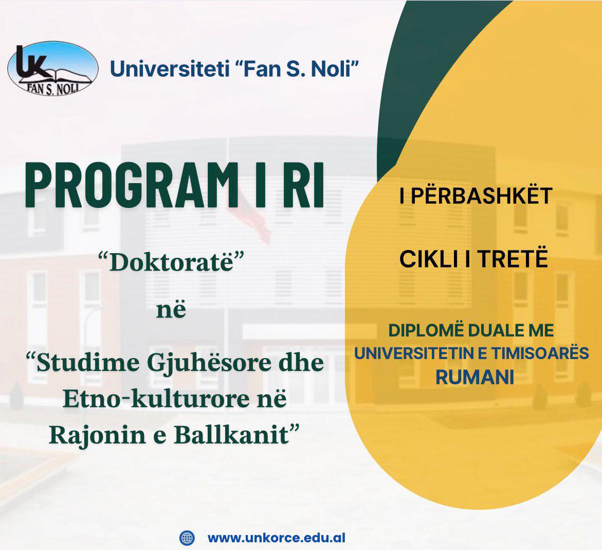 În pragul sărbătorilor de iarna Universitatea „Fan S. Noli” din Corcea a publicat pe pagina oficială un anunt important privind un program de doctorat comun cu o Universitate din România. Potrivit anuntului: “Universitatea „Fan S. Noli” vine cu o veste îmbucurătoare: Se lansează programul comun de studii universitare de doctorat (ciclul III) în domeniul „Studii lingvistice și etno-culturale în regiunea Balcanilor”, organizat de Universitatea „Fan S. Noli” și Universitatea din Timișoara, România. Acest program de doctorat reprezintă un pas important în direcția consolidării cercetării științifice, a inovării și a excelenței academice. Aprobarea acestui program de studii îmbogățește oferta academică a Universității „Fan S. Noli” și întărește misiunea noastră de a promova educația de calitate și cercetarea științifică contemporană”.