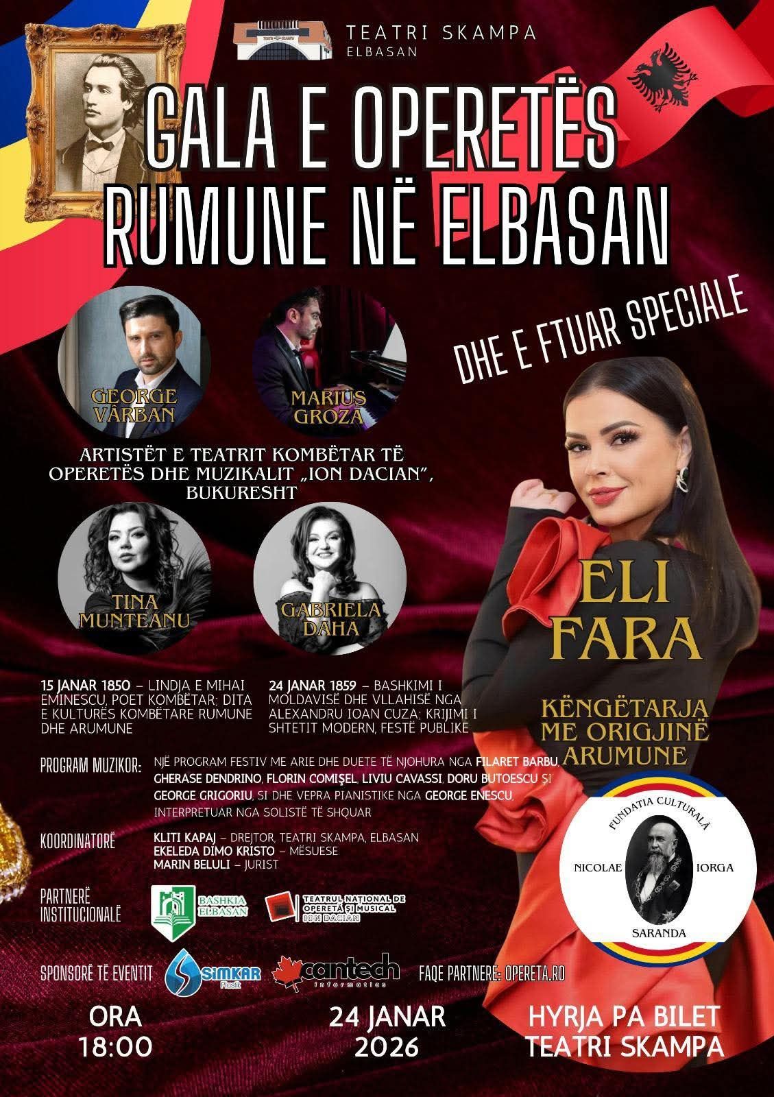 Teatrul Skampa din Elbasan va găzdui, în data de 24 ianuarie 2026, de la ora 18:00, evenimentul cultural deosebit „Gala Operetei Române la Elbasan”, o seară dedicată muzicii, eleganței și dialogului cultural româno-albanez. Pe scena teatrului vor urca artiști ai Teatrului Național de Operetă și Musical „Ion Dacian” din București, printre care George Vârban, Marius Groza, Tina Munteanu și Gabriela Daha, care vor interpreta un repertoriu festiv de arii și duete celebre din creația compozitorilor Barbu Lăutaru, Gherase Dendrino, Florin Comișel, Liviu Cavassi, Doru Bădoescu și George Grigoriu, alături de lucrări pianistice semnate de George Enescu. Invitata specială a serii este Eli Fara, cântăreață de origine aromână, a cărei prezență aduce un plus de emoție și valoare artistică evenimentului. Gala are o semnificație simbolică aparte, fiind organizată în apropierea a două repere importante ale culturii și istoriei românești: