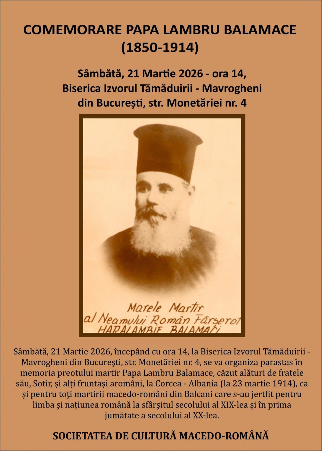 Sâmbătă, 21 martie 2026, începând cu ora 14:00, la Biserica Izvorul Tămăduirii – Mavrogheni din București, va avea loc o ceremonie de comemorare dedicată preotului martir Papa Lambru Balamace (1850–1914), una dintre figurile emblematice ale aromânilor din Balcani. Evenimentul, organizat de Societatea de Cultură Macedo-Română, va include un parastas în memoria lui Haralambie (Papa Lambru) Balamace, considerat un mare martir al neamului român fărșerot. Acesta și-a pierdut viața în mod tragic, alături de fratele său Sotir și de alți fruntași aromâni, în orașul Corcea, la data de 23 martie 1914. Ceremonia nu este doar un act de rememorare a unei personalități marcante, ci și un prilej de omagiere a tuturor martirilor macedo-români din Balcani, care s-au jertfit pentru păstrarea identității, limbii și culturii române. Sacrificiul acestora, petrecut în special la sfârșitul secolului al XIX-lea și în prima jumătate a secolului al XX-lea, rămâne un reper important în istoria comunităților aromâne. Prin organizarea acestui eveniment, inițiatorii își propun să readucă în atenția publicului larg contribuția și suferințele românilor din sudul Dunării, precum și importanța păstrării memoriei colective. Manifestarea de la Mavrogheni devine astfel un spațiu de reflecție, recunoștință și reafirmare a valorilor identitare. Publicul este invitat să participe la acest moment de reculegere și respect, dedicat unei pagini semnificative din istoria românilor balcanici.